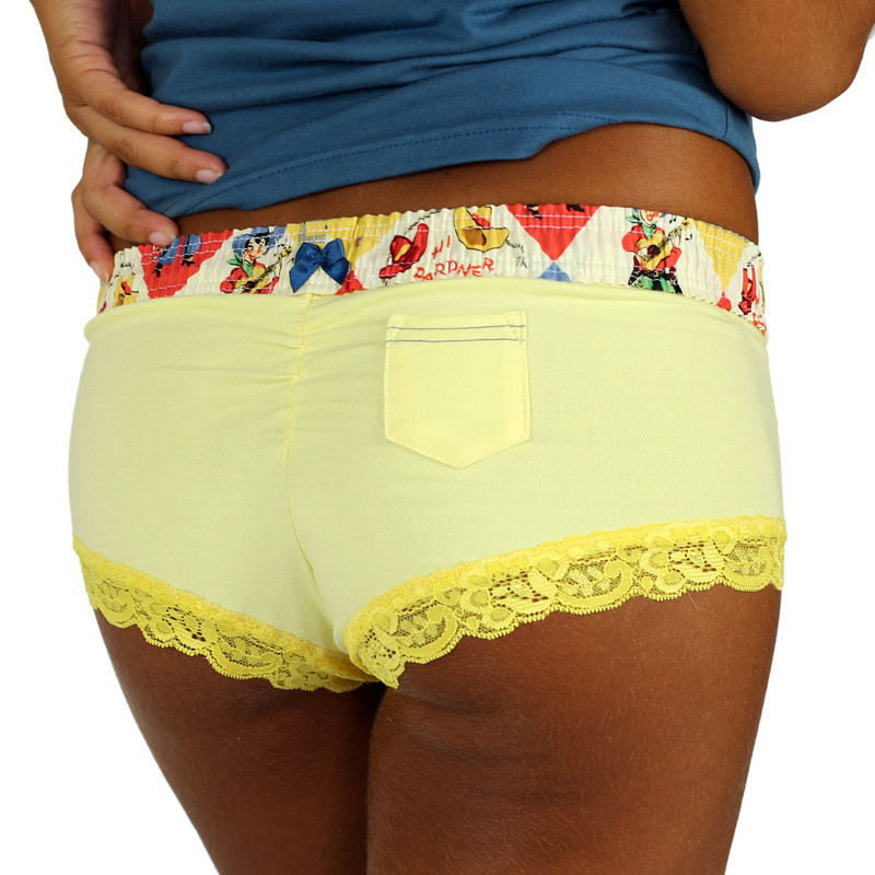 These Sexy Yellow Cheekster Boyshorts are designed with a fun retro cartoon Rodeo print FOXERS (boxer short style) waistband! These boyshorts panties are very cheeky with a snug fit that makes your tush look great and are designed with a slight ruching in the back seam that maximizes butt cuteness. The back features a little Lipstick Pocket and a small blue satin bow on the waistband. The legs are trimmed with a decorative and butter soft blue lace detailed with blue satin bows on each leg. Two black buttons are sewn below the waist that resemble a faux fly paired with contrasting blue stitching. These cute and comfy boxer panties are designed with a ultra soft cotton/spandex fabric, with the just the right amount of stretch for a great fit and a sexy look! 92% Cotton, 8% Spandex. Machine Wash. Imported.